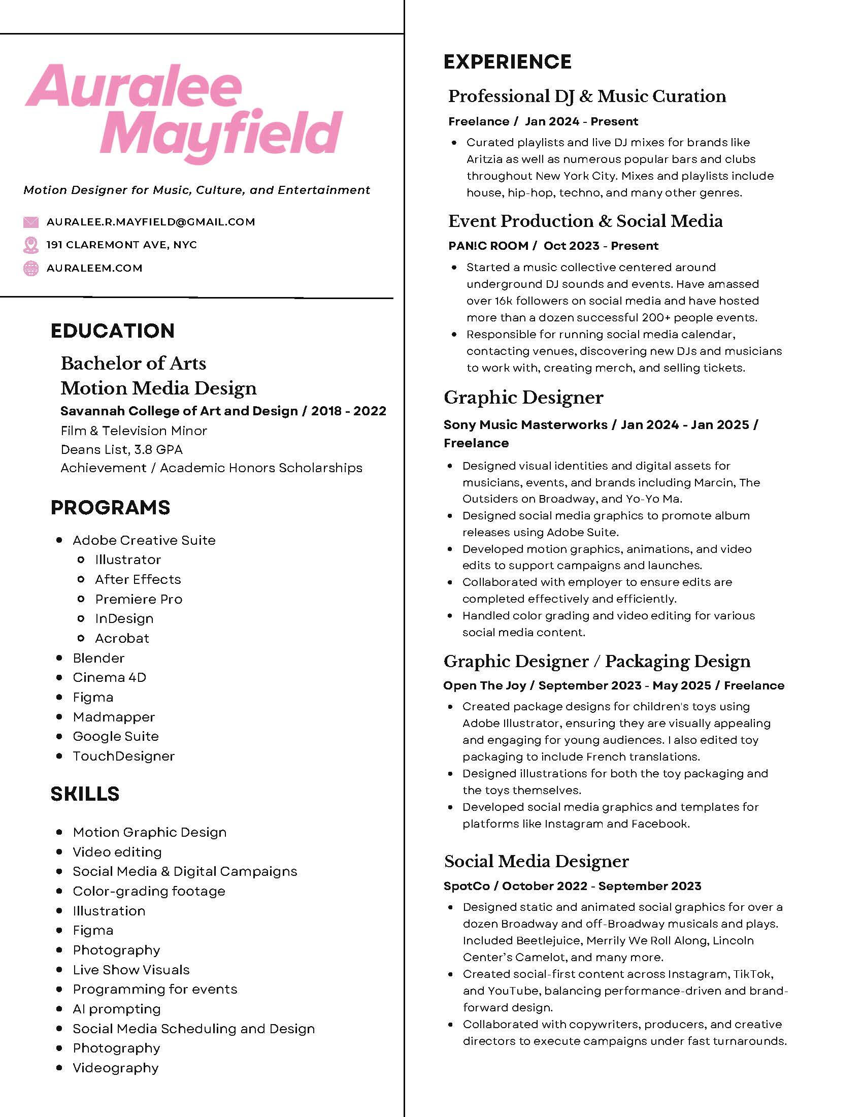 Graphic + Motion Designer for Music, Culture, and EntertainmentAuralee Mayfield is a NYC-based motion designer & art director specializing in music, entertainment, and culture. She has created design and video content for Sony Music Masterworks, Spotify, and Broadway productions, as well as collaborating with independent artists and collectives like PAN!C ROOM.Designs featured on Spotify, Apple Music, Broadway, and more.Keep up to date with her on Instagram.